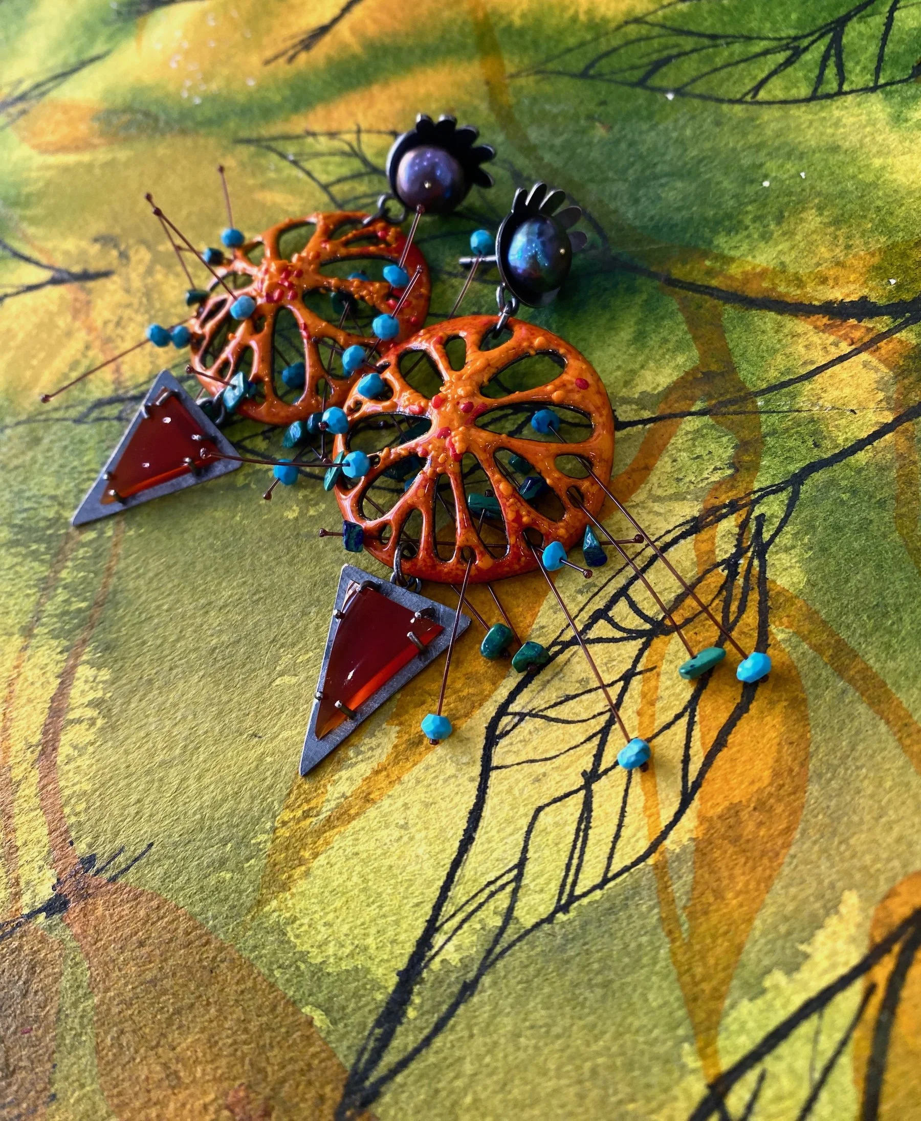 Bold statement earrings with orange enamelled elements, geometrically cut carnelian, ‘peacock’ pearls, bright turquoise and malachite.