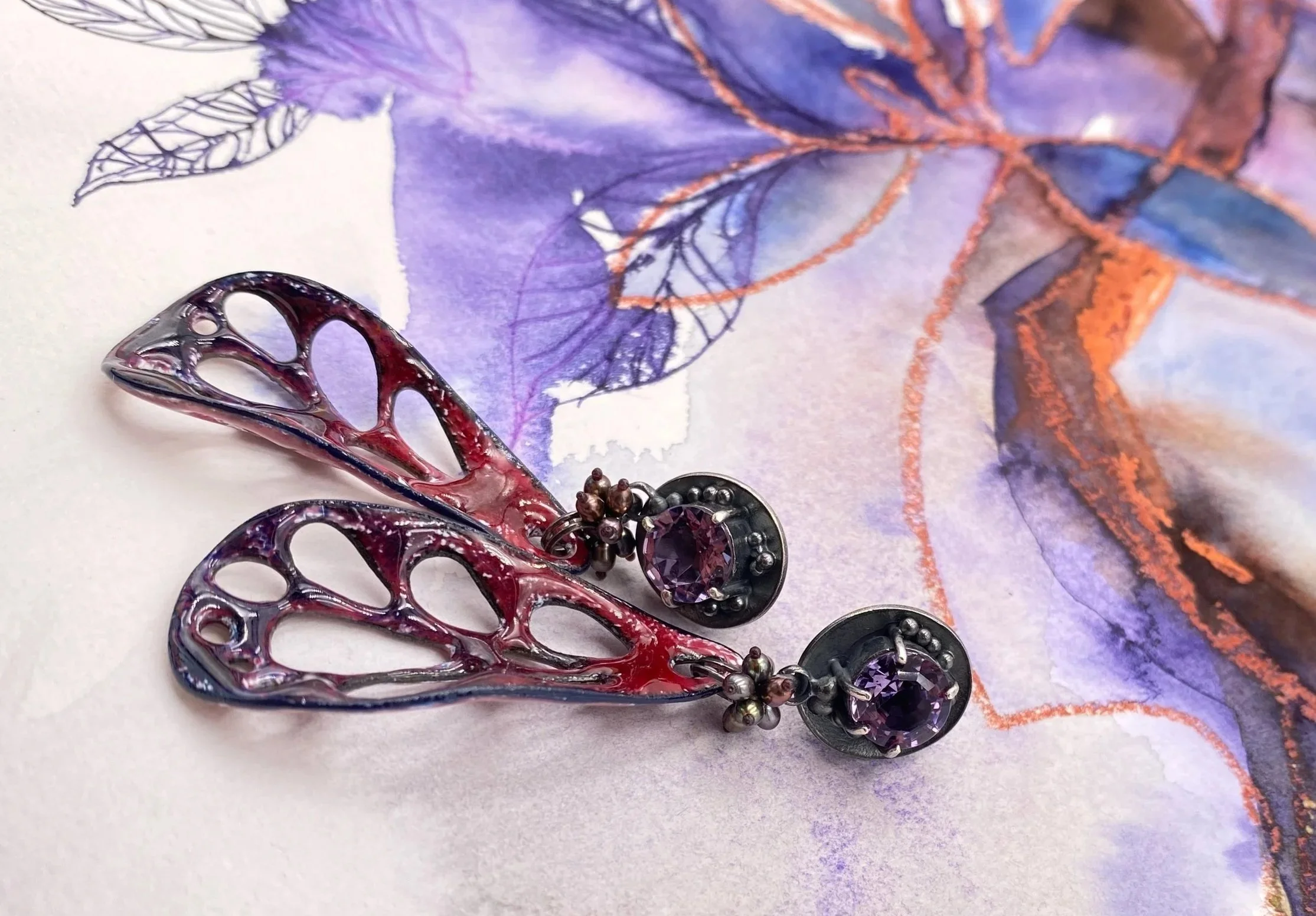 These large Amethyst Berry Drop earrings are carefully enamelled in rich mulberry and grape tones, set with beautifully cut light-purple amethysts in one-of-a-kind asymmetrical fantasy prong settings.