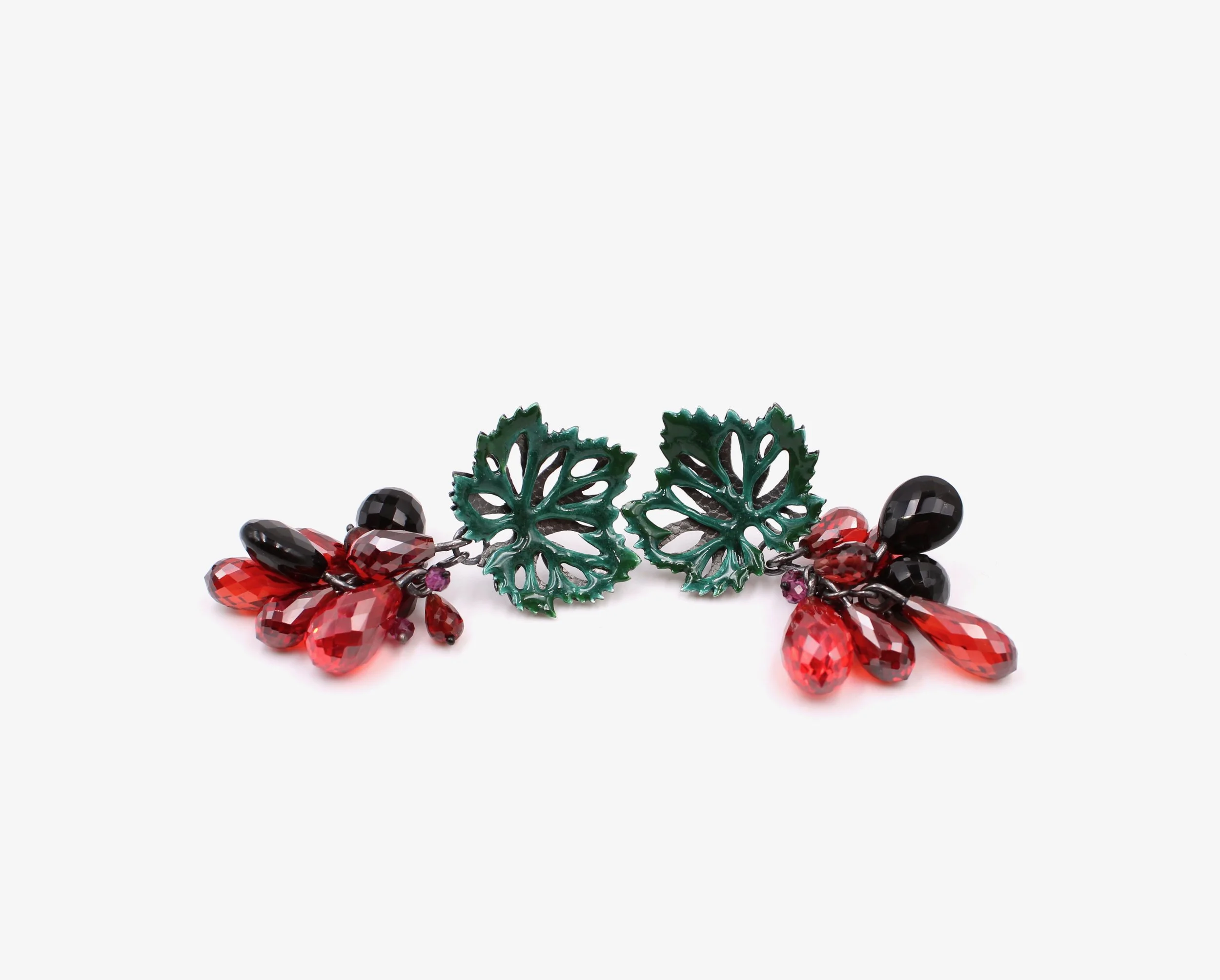 Grape & Vine bespoke earrings. Created for a special wedding outfit. Dark green enamel on silver, patinated sterling silver with a tassle of garnet, onyx and cubic zirconia.